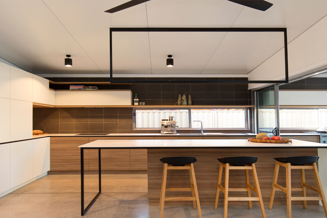 The custom-made feature light was made from black powder-coated aluminium and an LED strip. The light illuminates the island bench and creates an artistic ambiance. A matching shadow line flows around the perimeter of the space to add visual continuity.