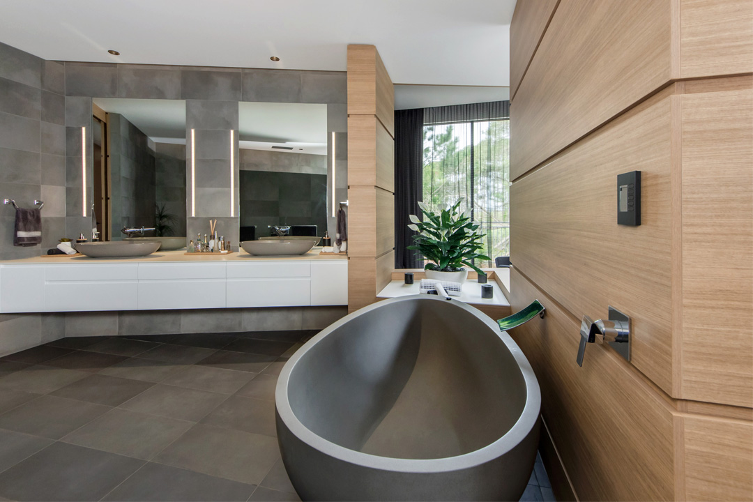 Featuring a waterfall mixer, the egg-shaped freestanding bathtub is the perfect place in which to relax. Positioned against a timber partition wall, the bathtub overlooks the home’s lush landscaping, while the innovative layout provides total privacy.