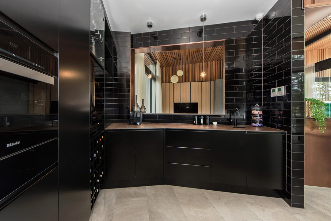 Beautifully complementing the eye-catching copper walls, the Neolith island bench showcases a burnished finish that imbues the space with rustic charm. Doubling as a breakfast bar, the expansive island is ideal for the clients’ social lifestyle. The splashback features glossy black subway tiles that reflect the natural light from the adjacent floor-to-ceiling windows. The tiles were also used on the kitchen’s right side for visual cohesion.
