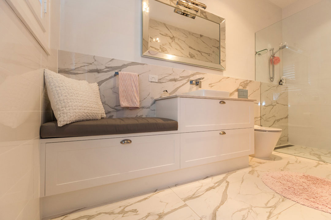 The powder room has a lovely cushioned bench, which is a unique and luxurious addition to the space. Like the main bathroom, the space features marble-effect walls that offer an extravagant touch. The walls match the kitchen splashback for a cohesive appearance throughout the home.