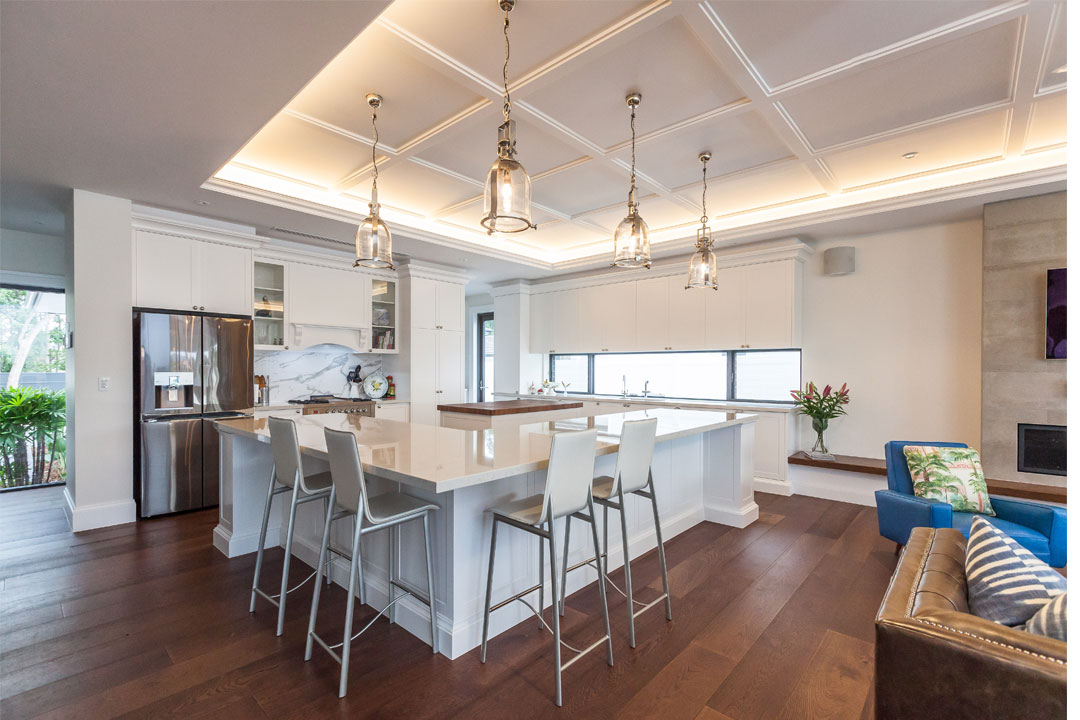 Artistry In Cabinets also created this sophisticated Hamptons-style kitchen in a way that showcases its consistently high level of craftsmanship. A range of elegant features are included such as brushed-nickel knobs and cup handles, glass doors above the cooktop, and a custom-made canopy rangehood.