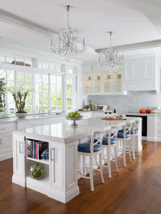 This stylish yet functional Hamptons design combines a classical aesthetic with modern features, including an expansive island bench, a neat breakfast nook, a spacious butler’s pantry, heating and cooling drawers, and three separate sink stations.