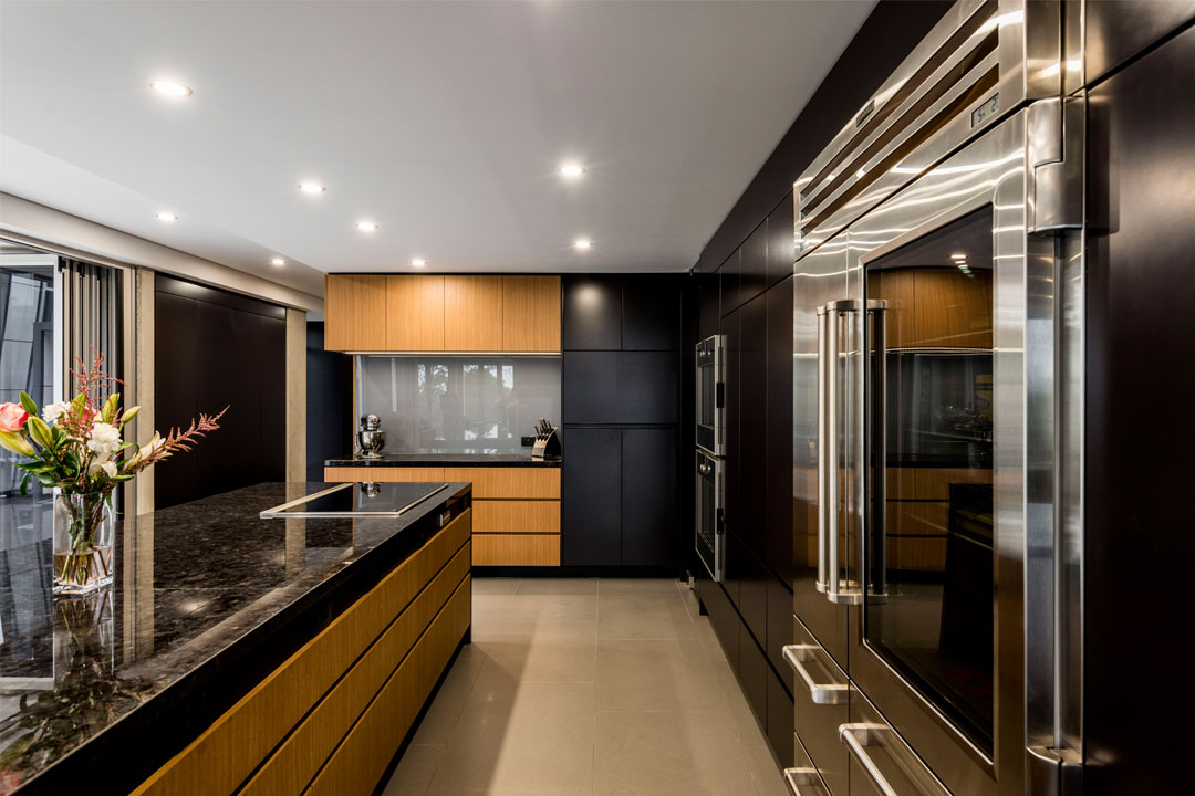 This sleek and functional kitchen was constructed by J & C Cabinets for its clients who requested an appealing space for entertaining and everyday use. The company met these requirements by using a contemporary colour palette of dark laminate and timber veneer, which provide great visual appeal.