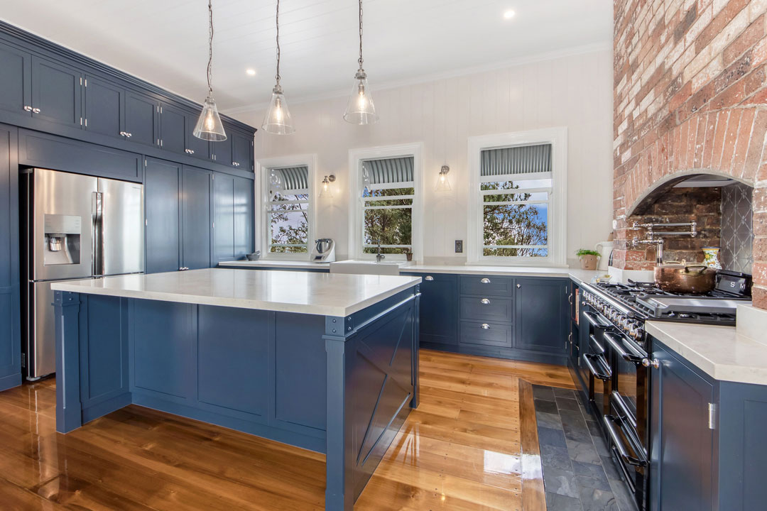 Energy-efficient LED lighting offers ample illumination, supported by vintage-style pendant lights above the island bench, and matching wall lights on either side of the sink.