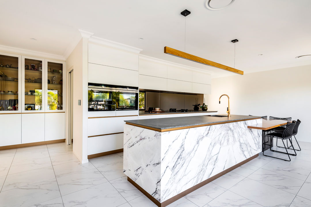 Positioned to take full advantage of the waterfront views, the stunning island bench features a Caesarstone Rugged Concrete top and New York marble panels, as well as a blackbutt chevron timber extension. The large bench segment provides ample space for the homeowners to prepare and serve food, while the attached table comfortably seats five for casual meals with guests.