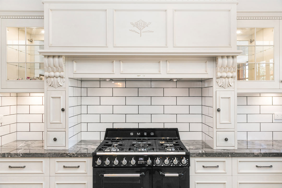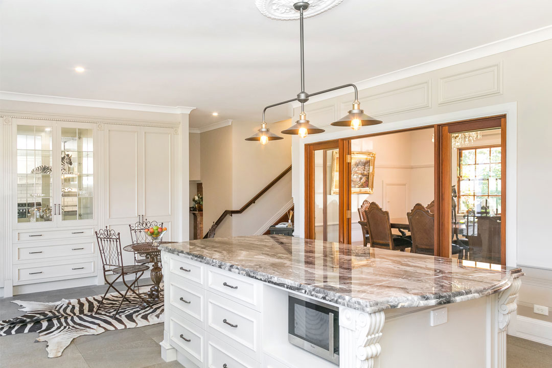 The 3m island bench exudes extravagance with its marbled-granite benchtop, which beautifully reflects the three hanging lights. The subway-tile splashback perfectly complements the industrial style of the hanging lights. Pilasters with corbels and rosettes enhance the luxurious theme, which has a modern colour palette of white and grey.
